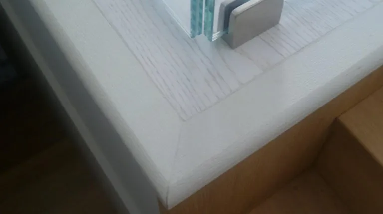 CP in dousiè, verniciato, spazzolato, bisellato, scelta nature accurata. Materiale prodotto interamente in Italia con particolare del battiscopa laccato bianco modello ducale.